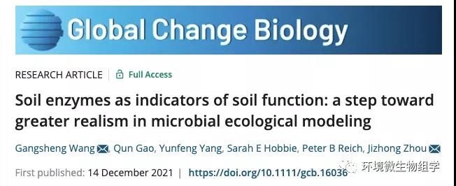 ? ? 2021年12月14日,權威學術期刊Global Change Biology發表相關研究論文,武漢大學水資源與水電工程科學國家重點實驗室/俄克拉荷馬大學王綱勝為該論文第一作者兼通訊作者,俄克拉荷馬大學周集中教授為共同通訊作者,論文題目:Soil enzymes as indicators of soil function: a step toward greater realism in microbial ecological modeling。