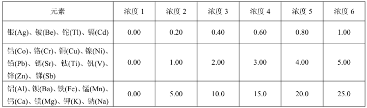 標準曲線的繪制:依次配制一系列待測元素的標準溶液,可根據實際樣品中待測元素濃度情況調整校準曲線的濃度范圍。分別移取一-定體積的多 元素混合標準溶液(5.12) ,用硝酸溶液(5.8) 配制系列標準曲線,參考濃度見表5。將標準溶液由低濃度到高濃度依次導入電感耦合等離子體發射光譜儀,按照儀器參考測量條件(8.1)測量發射強度。以目標元素系列質量濃度為橫坐標,發射強度值為縱坐標,建立目標元素的校準曲線。