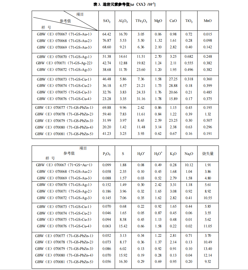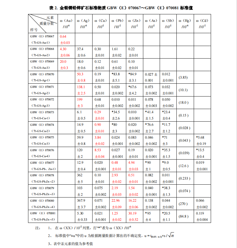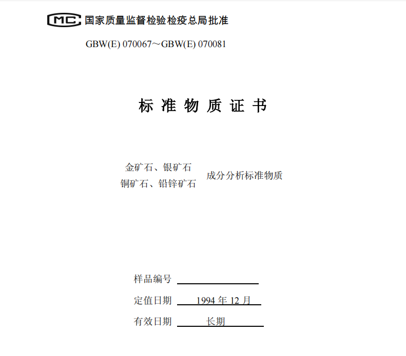 GBW(E) 070067~GBW(E) 070081金礦石、銀礦石、銅礦石、鉛鋅礦石成分分析標準物質清單