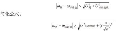 如果實(shí)驗(yàn)室對(duì)標(biāo)準(zhǔn)物質(zhì)的測(cè)量值超出了標(biāo)準(zhǔn)物質(zhì)特性量值的不確定度范圍,是不能直接 得出測(cè)量結(jié)果存在偏差的結(jié)論的,原因是標(biāo)準(zhǔn)物質(zhì)的不確定度 U 標(biāo)準(zhǔn)物質(zhì)僅包括了與標(biāo)準(zhǔn)物質(zhì)定 值、均勻性、穩(wěn)定性有關(guān)的不確定度,沒有涉及用戶在實(shí)驗(yàn)室里對(duì)標(biāo)準(zhǔn)物質(zhì)進(jìn)行測(cè)量有關(guān)的 隨機(jī)不確定度 U 測(cè)。因此,應(yīng)采取以下通用公式判斷標(biāo)準(zhǔn)物質(zhì)測(cè)量值與標(biāo)準(zhǔn)值之間存在顯著偏差: